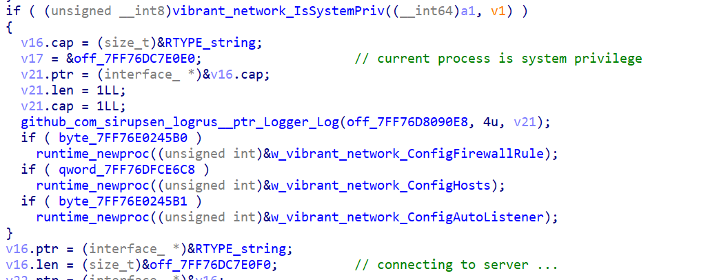 Die Malware überprüft die Gruppenmitgliedschaft des aktuellen Prozesstokens, um seine Berechtigungsstufe zu bestimmen. Es überprüft, ob der Prozess zum LocalSystem-Konto gehört, indem es eine SID mit dem SECURITY_LOCAL_SYSTEM_RID initialisiert und CheckTokenMembershipaufruft. Ist dies nicht der Fall, wird versucht, die Mitgliedschaft in der Gruppe Administratoren zu überprüfen, indem mithilfe von SECURITY_BUILTIN_DOMAIN_RID und DOMAIN_ALIAS_RID_ADMINS eine SID erstellt und eine ähnliche Überprüfung der Tokenmitgliedschaft durchgeführt wird.