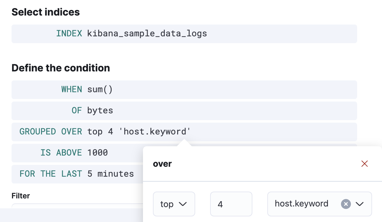 clause, specify whether the aggregation is applied over all documents or split into groups using a grouping field. If grouping is used, an alert will be created for each group when it exceeds the threshold. To limit the number of alerts on high cardinality fields, you must specify the number of groups to check against the threshold. Only the top groups are checked. - Choose a threshold value and a comparison operator (