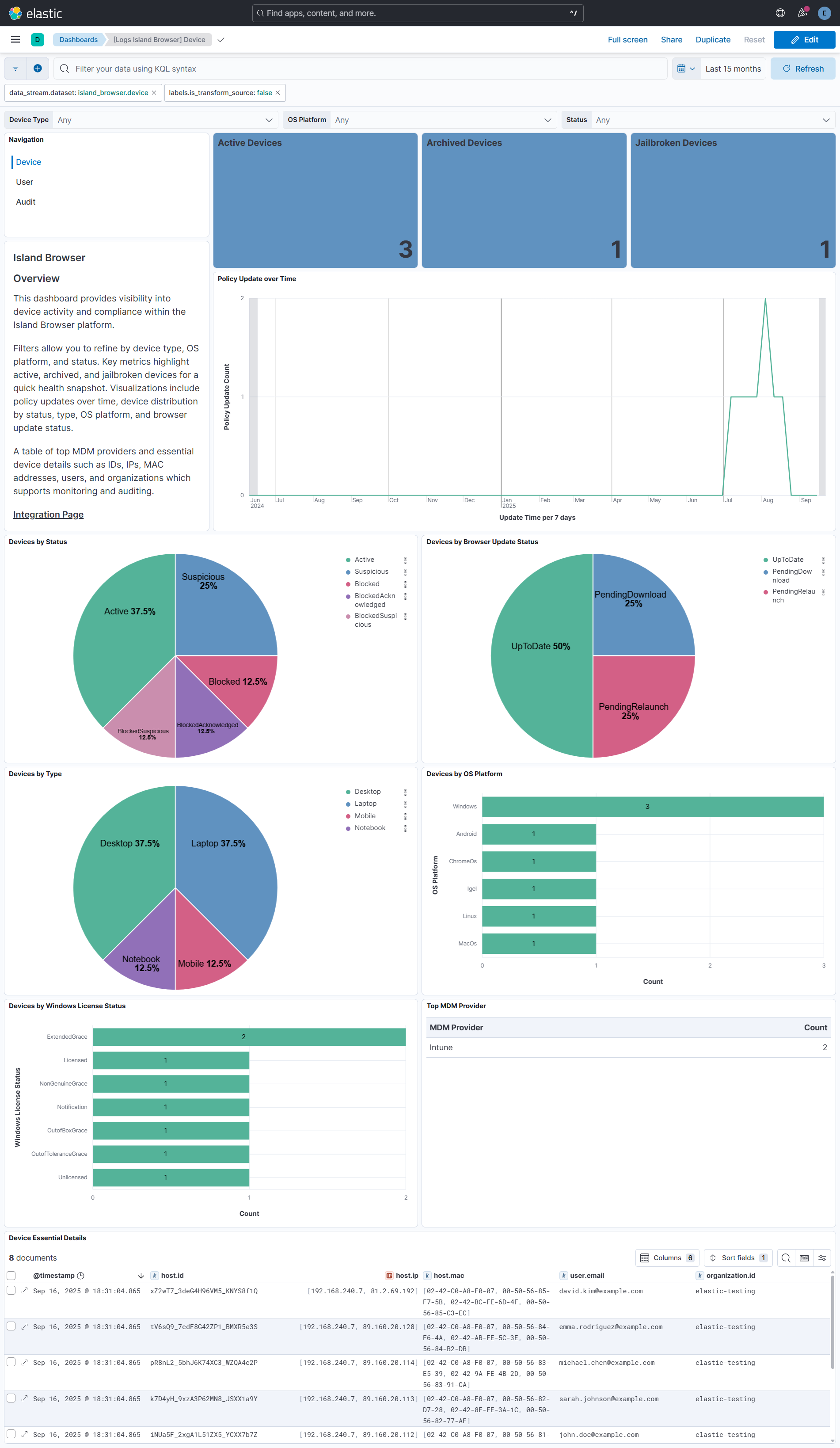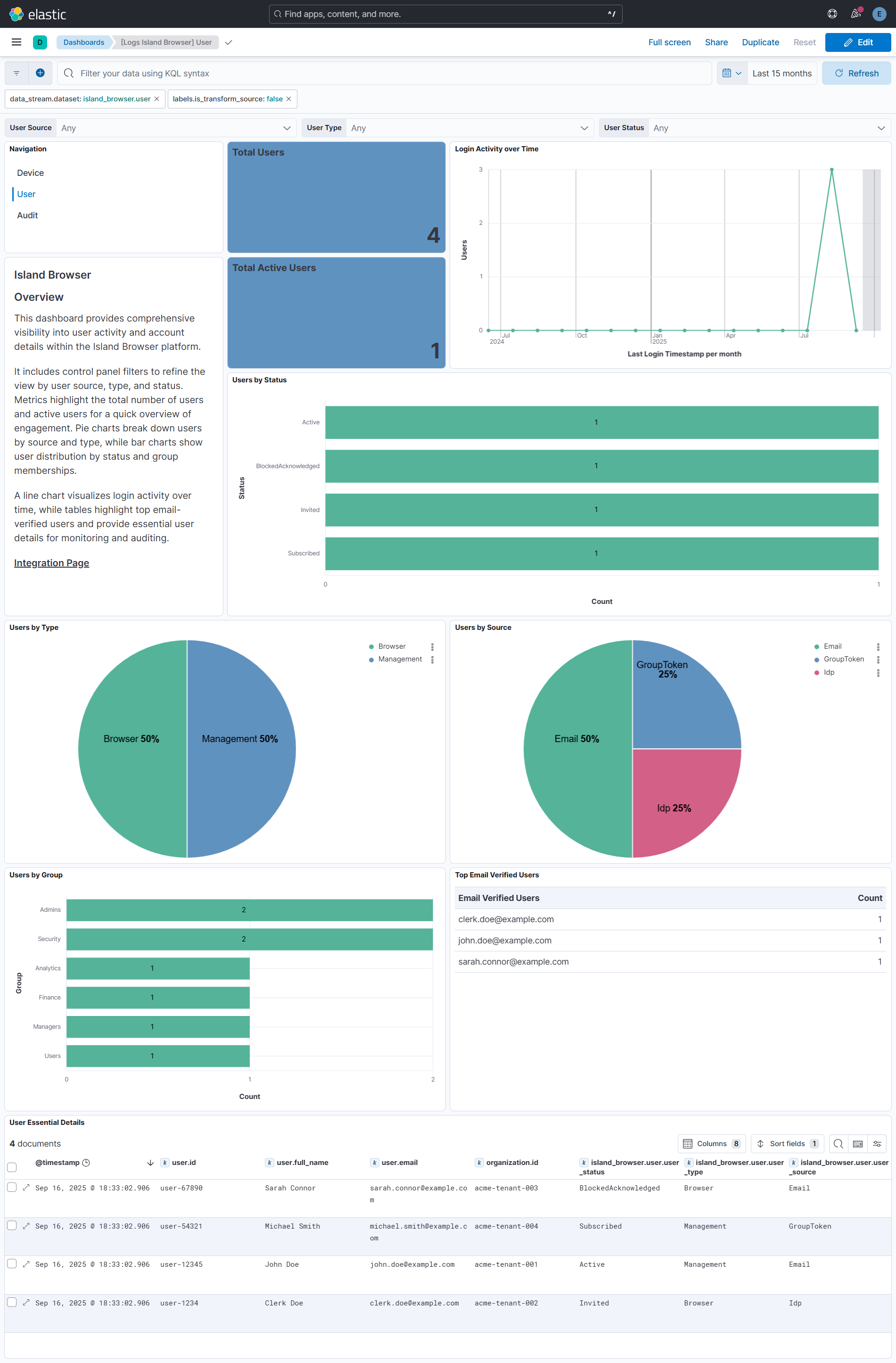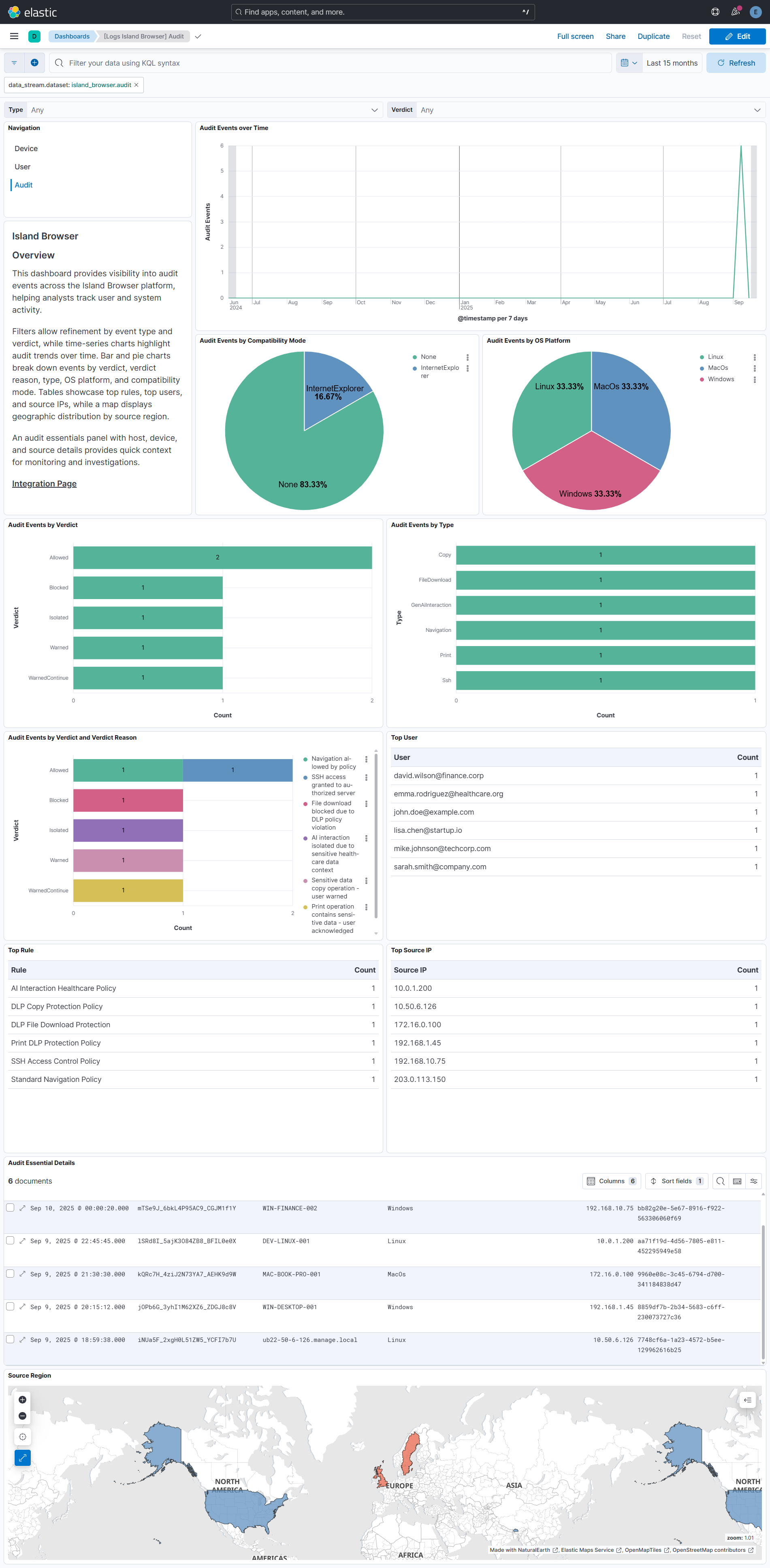 Integrating Island Browser User, Device, and Audit endpoint data with Elastic SIEM provides unified visibility into identity activity, device posture, and security events across the environment.
