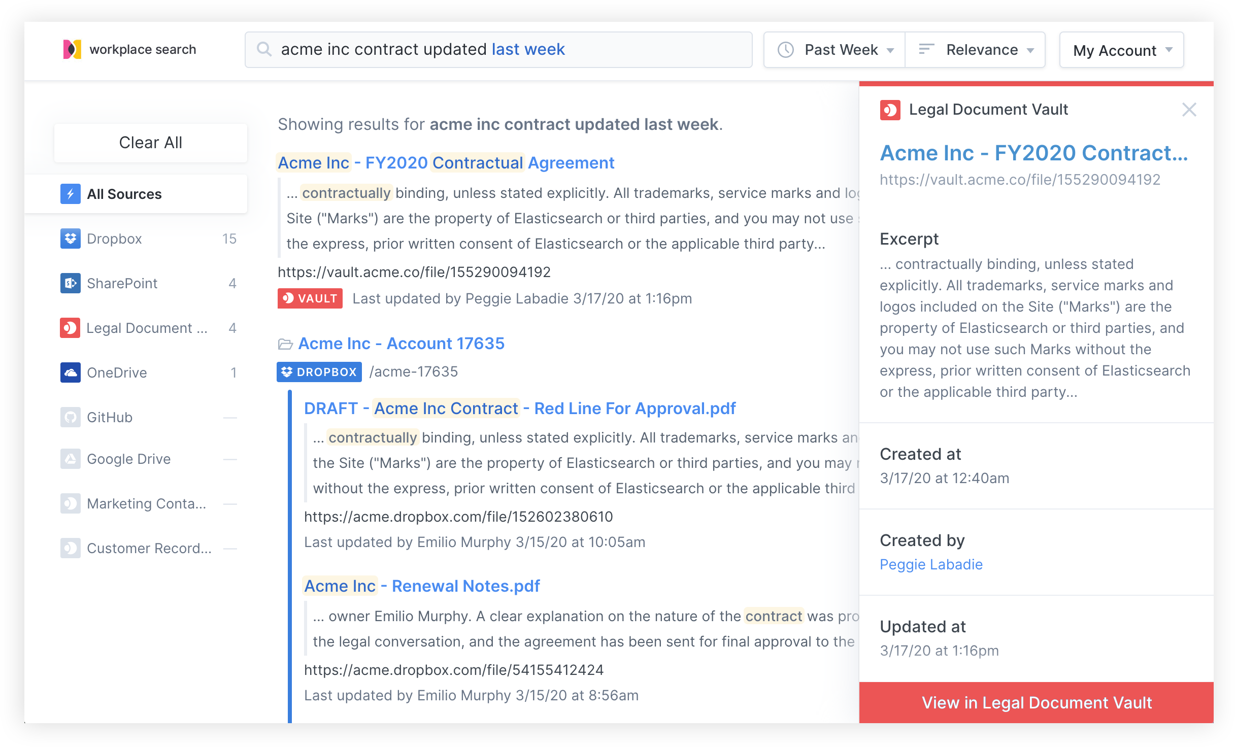 Modern search experiences are provided with Workplace Search, allowing team members and collaborators to find information and files from a feature-rich, standalone platform. It is a fast, scalable, and intuitive way to rollout search across your organization, and will continue evolving over time.