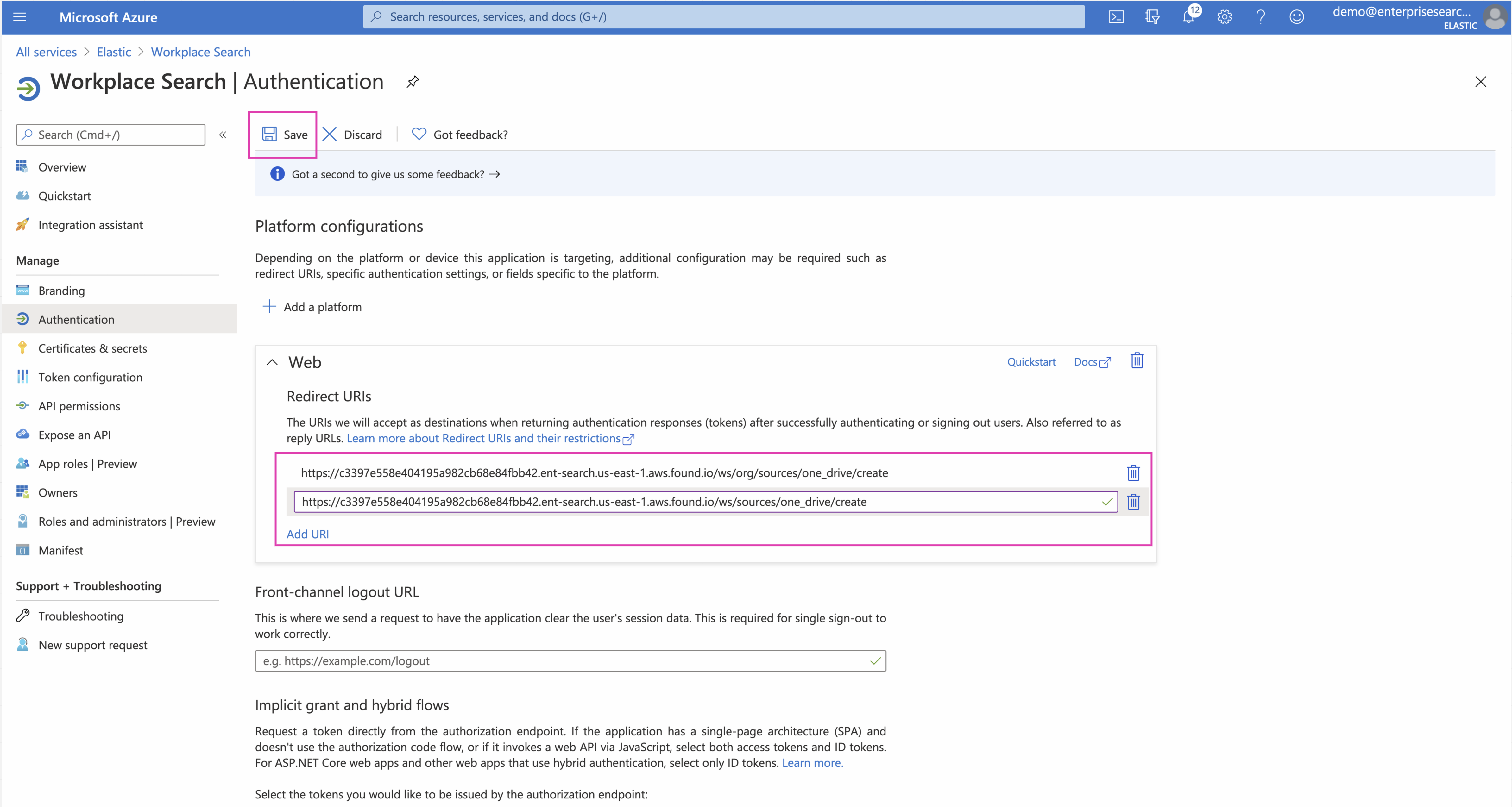 When using standalone Enterprise Search, add the following two redirect URIs, substituting <WS_BASE_URL> with the base URL at which Workplace Search is hosted (scheme + host, no path).