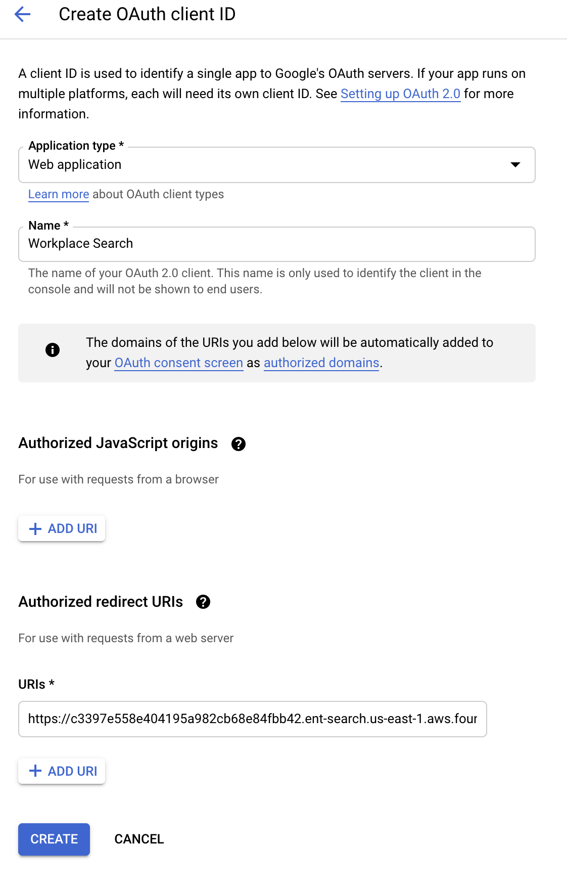 • Authorized redirect URIs: The redirect URI for your Workplace Search installation.