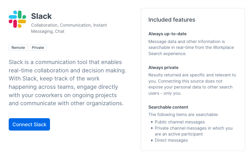 Remote sources like Slack are private sources. Once you have configured the connector, each individual member must add it as a unique private source via their personal settings. The connecting person can access their own private channels and direct messages, and only they have access. Each member may connect only one Slack private content source.