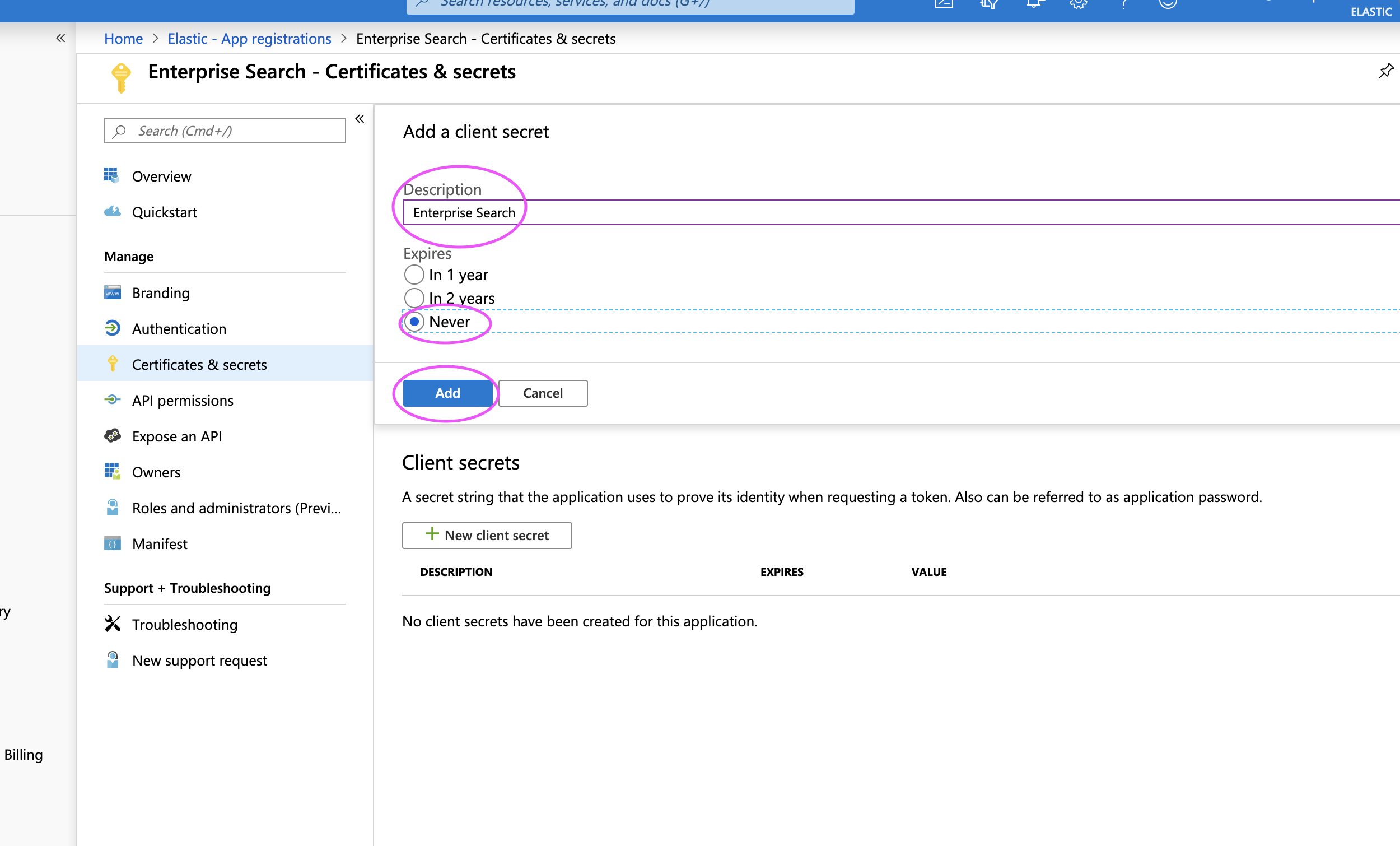 Step 9. Pick a name for your client secret (for example, Workplace Search). Select Never as the expiration date: