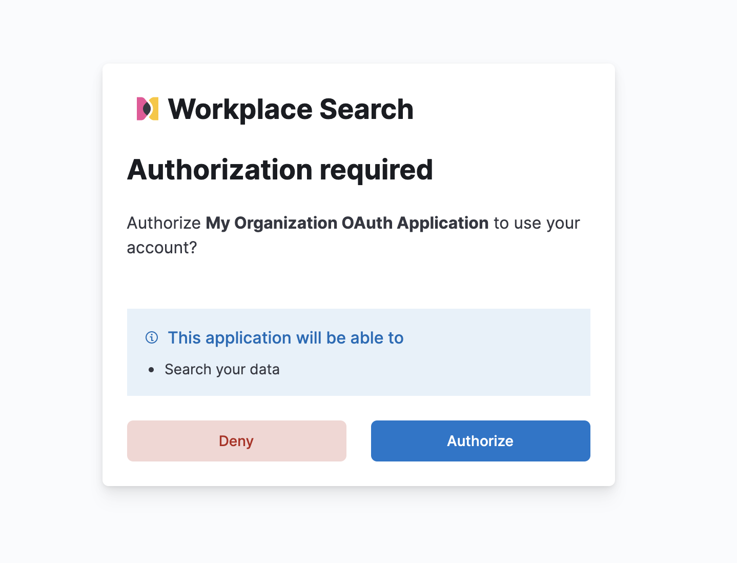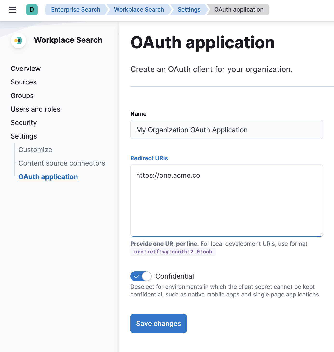 editThe first step towards designing and implementing a custom search experience for Workplace Search is to create an OAuth application from the administrative dashboard. This OAuth application will ensure proper authentication of users and secure access to content.