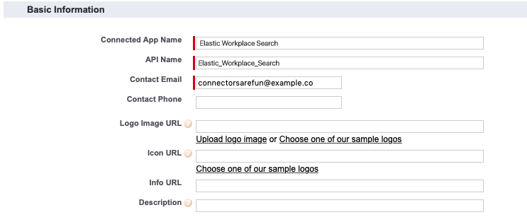- Connected App Name: A name to help you identify the application. Workplace Search, or something like that.