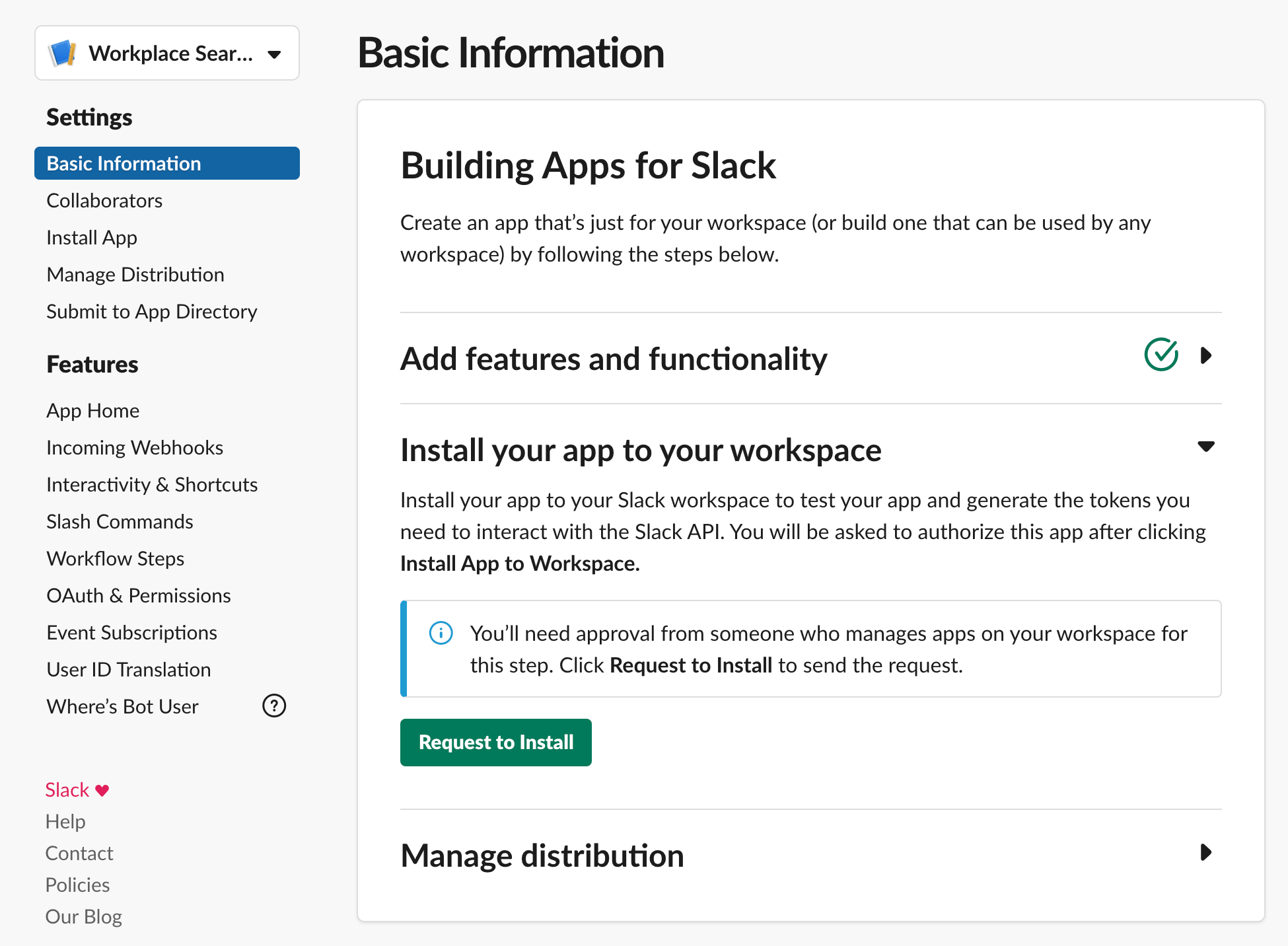 Step 5. Next, on the left-hand side of the application menu, click Basic Information. Under the section Install your app to your workspace, select Install or Request to Install your application. Which you will see depends on your permissions. An admin must approve the application if you lack the permissions to do so.