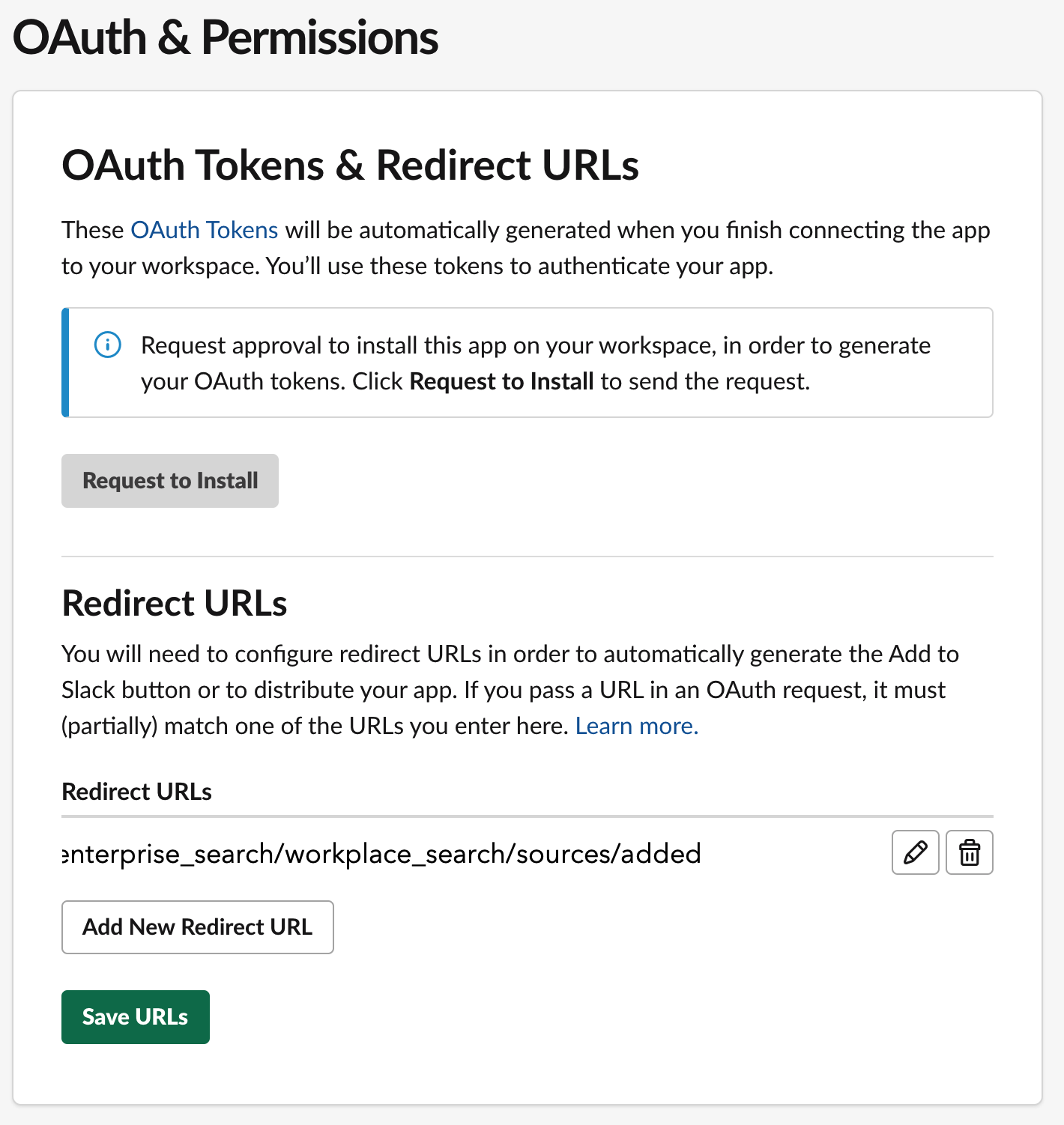 Configuring the Slack connector is the first step prior to connecting the Slack service to Workplace Search, and requires that you create an OAuth App from the Slack platform.