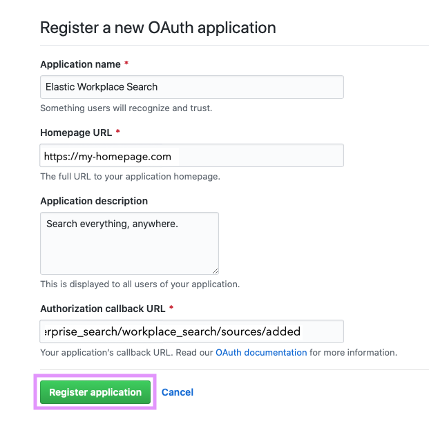 • Authorization callback URL: Add the Workplace Search OAuth redirect URL for your deployment.