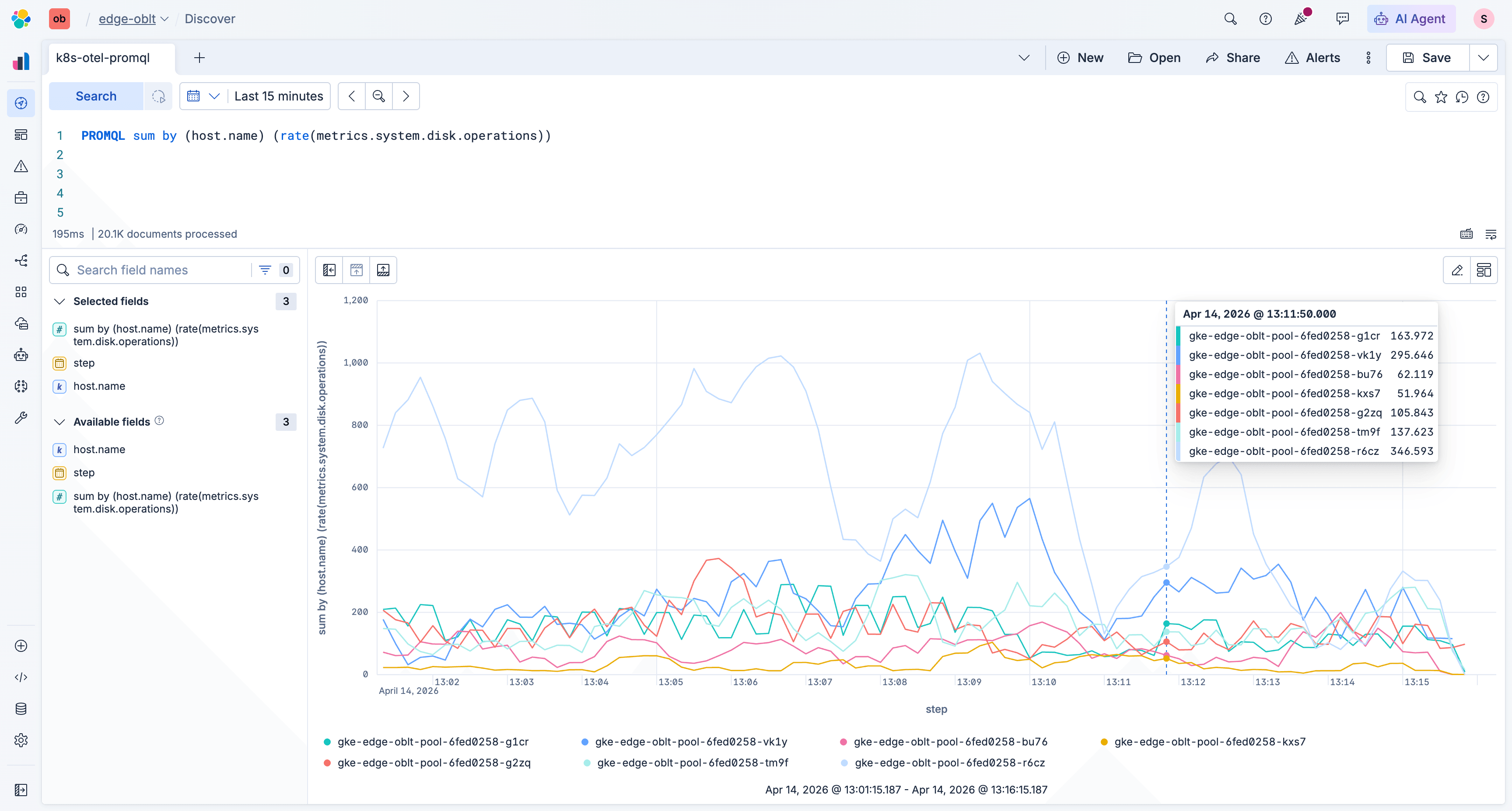 You can also run PromQL queries in the ES|QL mode of Discover, which shows results in a table and an XY chart. Stay tuned for a full walkthrough of using PromQL in Kibana Dashboards, Discover, and Alerting in a dedicated Kibana blog post.