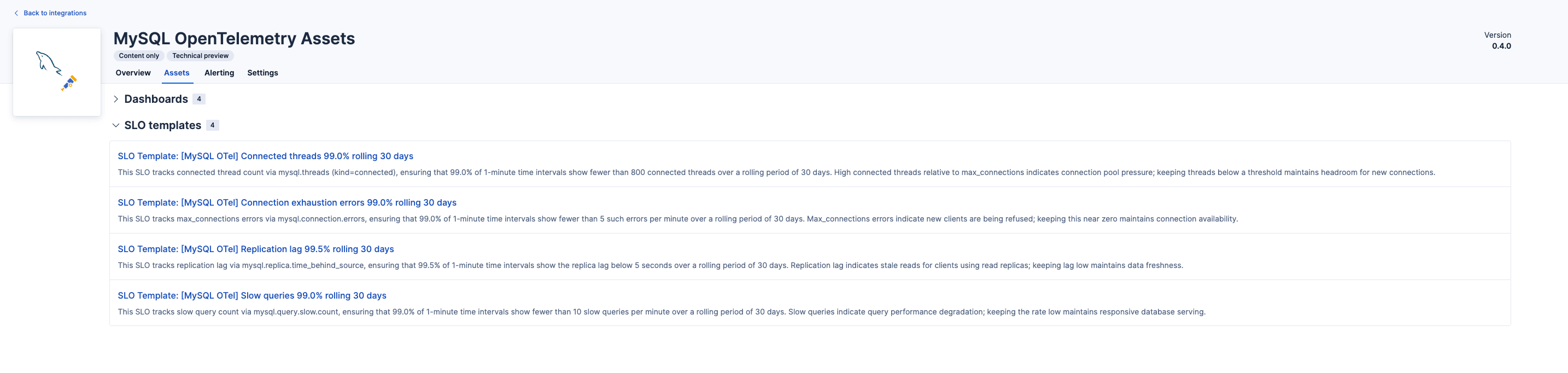 Four SLO templates are included out of the box, tracking replication lag, connection exhaustion errors, slow query rate, and connected thread count — each with a pre-configured target and 30-day rolling window. Teams can adopt them as-is or tune the thresholds to match their own reliability requirements.