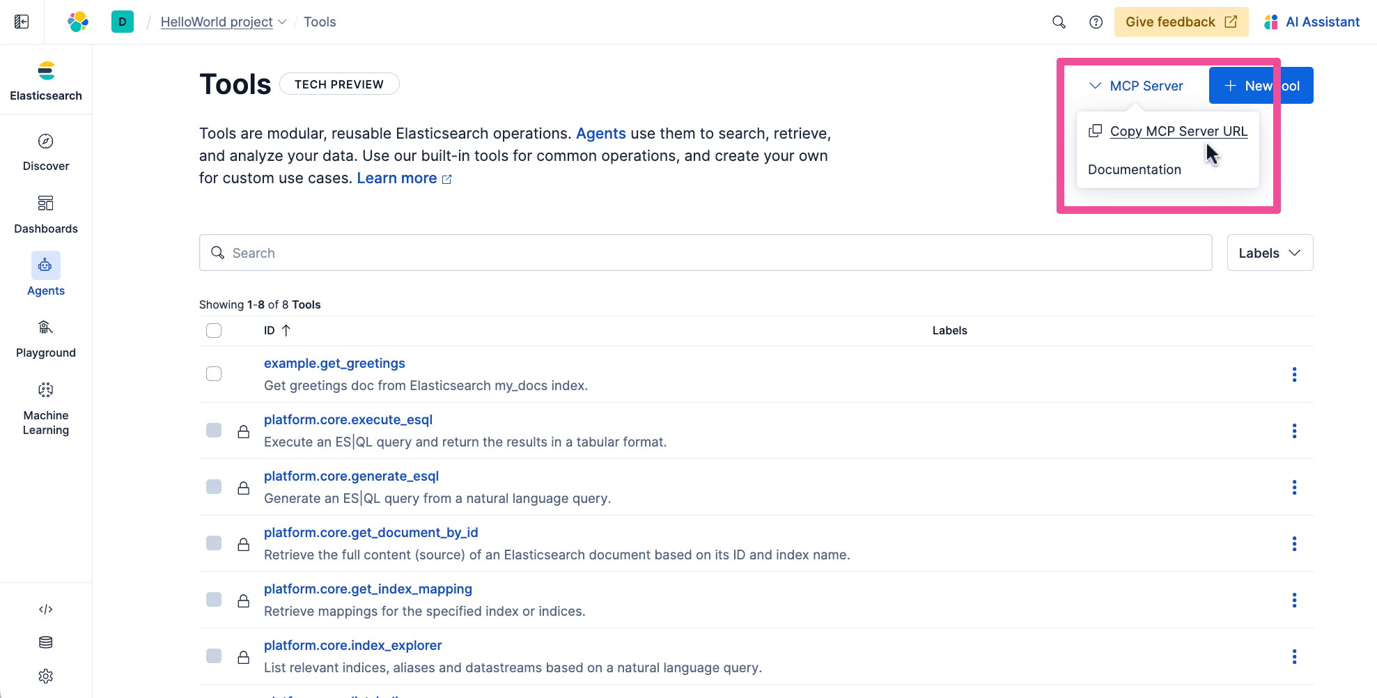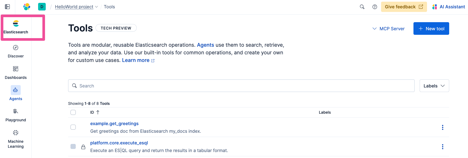 As you’ve seen the default agent in Elastic Agent builder is already useful for chatting with your data but to really give agents custom powers, they need access to tools via the Model Context Protocol (MCP). Agent Builder has fully featured tool creation and management functionality that you can use to quickly create custom MCP tools that are hosted right in the same scalable Elastic project as your data.