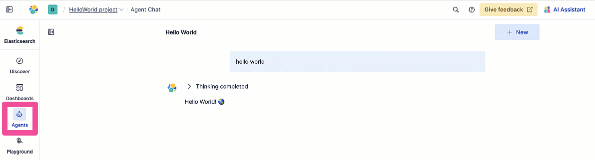 Select the HelloWorld Agent from the Agent Chat agent selector. Enter the prompt “hello world” and you should get back the Hello World text from the greetings.md document stored in the my-docs Elastic index.