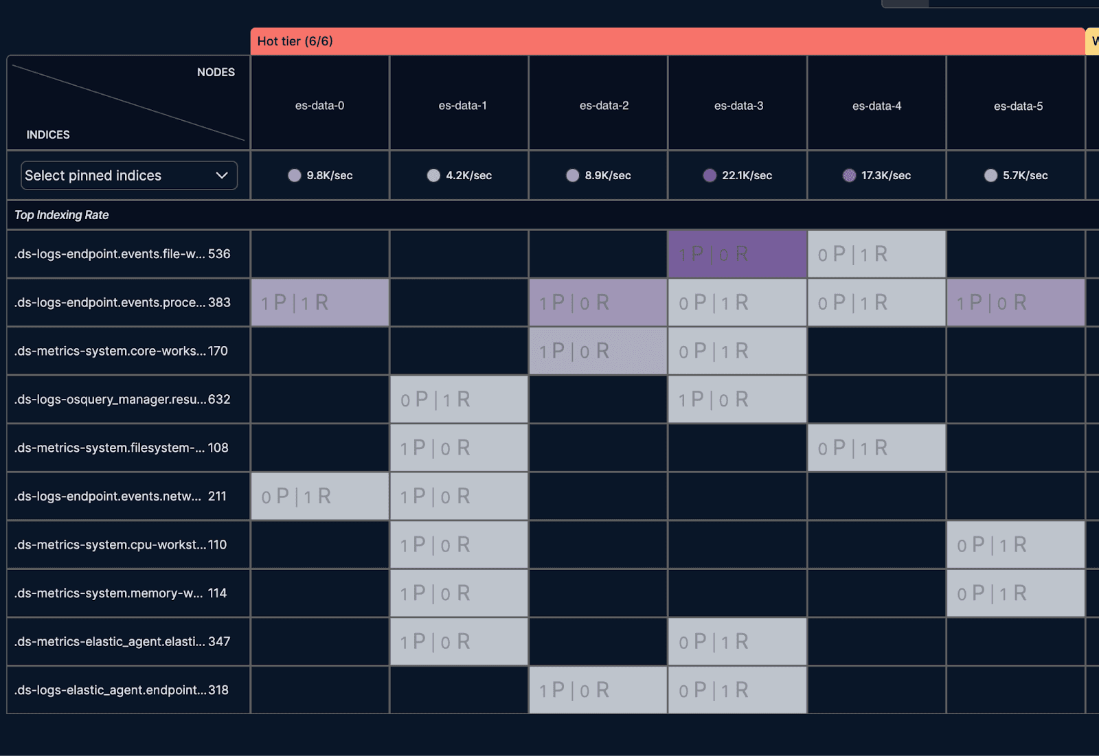 Next, we navigated to the shard Analyzer page, which visualizes sharding hotspots. The visualization made it clear that this particular node had the highest ingestion rate and was managing two write indices. The graph also indicated other nodes that were underutilized: