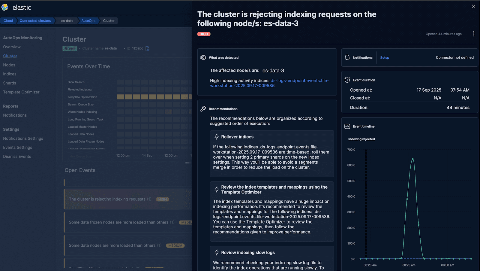 After receiving the standard alert, we checked AutoOps for additional context. AutoOps flagged the same issue but provided extra crucial detail, including the exact index causing the write rejections: