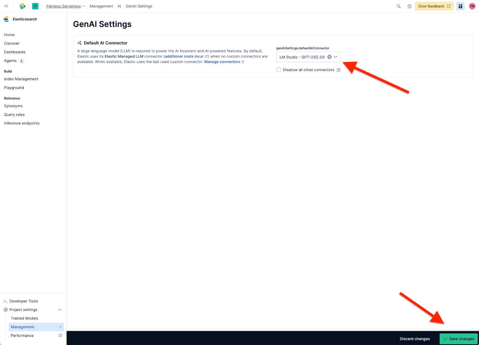 Before we can create our new agent, we have to set our Agent builder to use our custom connector called LM Studio - GPT-OSS 20B because the default one is the Elastic Managed LLM. For that, we need to go to Project Setting > Management > GenAI Settings; now we select the one we created and click Save.