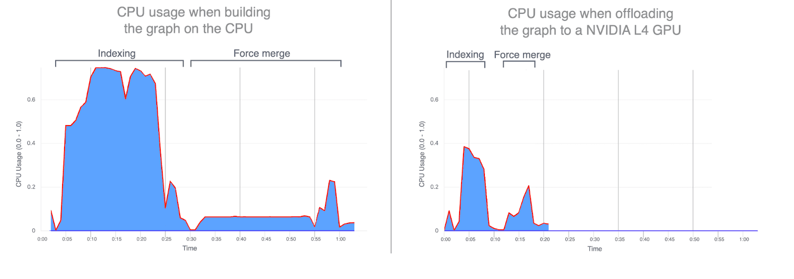 - CPU usage: Offloading graph construction to the GPU significantly reduces both average and peak CPU utilization. The graphs below illustrate CPU usage during indexing and merging, highlighting how much lower it is when these operations run on the GPU. Lower CPU utilization during GPU indexing frees up CPU cycles that can be redirected to improve search performance.