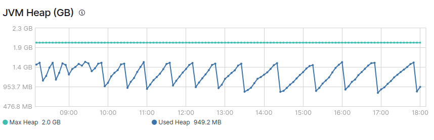 Typically, the heap usage will follow a saw tooth pattern, oscillating between around 30 and 70% of the maximum heap being used. This is because the JVM steadily increases heap usage percentage until the garbage collection process frees up memory again. High heap usage occurs when the garbage collection process cannot keep up. An indicator of high heap usage is when the garbage collection is incapable of reducing the heap usage to around 30%.