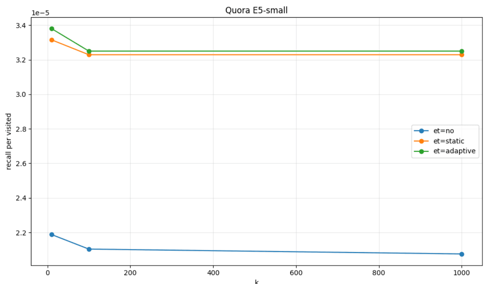 To visualize this, we can plot the amount of recall per visited node that we got with the patience based early termination (labeled as et=static), when compared to the default HNSW behavior (labeled as et=no) on a couple of datasets, FinancialQA and Quora, and models, JinaV3 and E5-small.