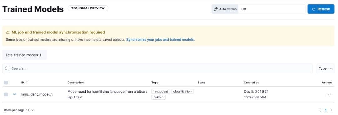 If you receive a message on the screen — ML job and trained model synchronization required — click on the link to synchronize models.