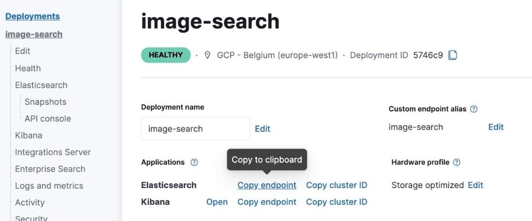 For the next step, you will need the Elasticsearch endpoint. You can get it from the Elasticsearch cloud console in the deployment detail section.