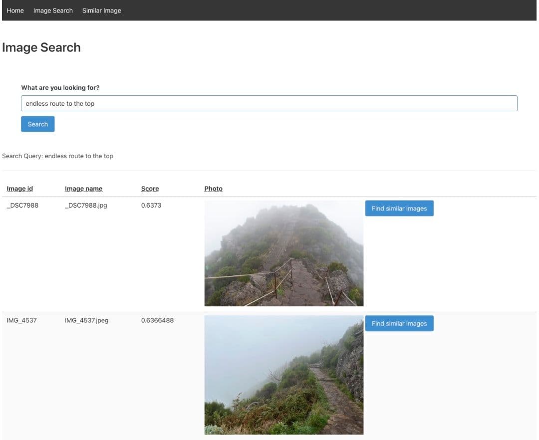 You can find the complete code in the GitHub repository. You may be inspecting the code in routes.py, which implements the main logic of the application. Besides the obvious route definition, you should focus on methods that define the _infer and _search endpoints ( infer_trained_model and knn_search_images ). The code that generates image embeddings is located in create-image-embeddings.py file.