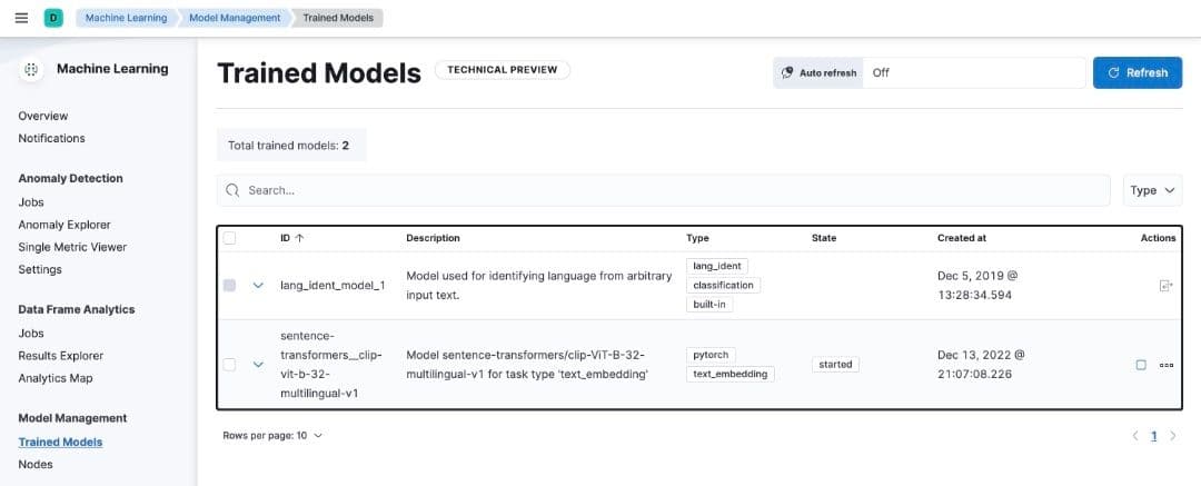 The upload might take a few minutes depending on your connection. When finished, check the list of Trained models on the machine learning Kibana page: Menu -> Analytics -> Machine Learning -> Model management ->Trained models. Verify that the NLP Clip model is in the state ‘started’.