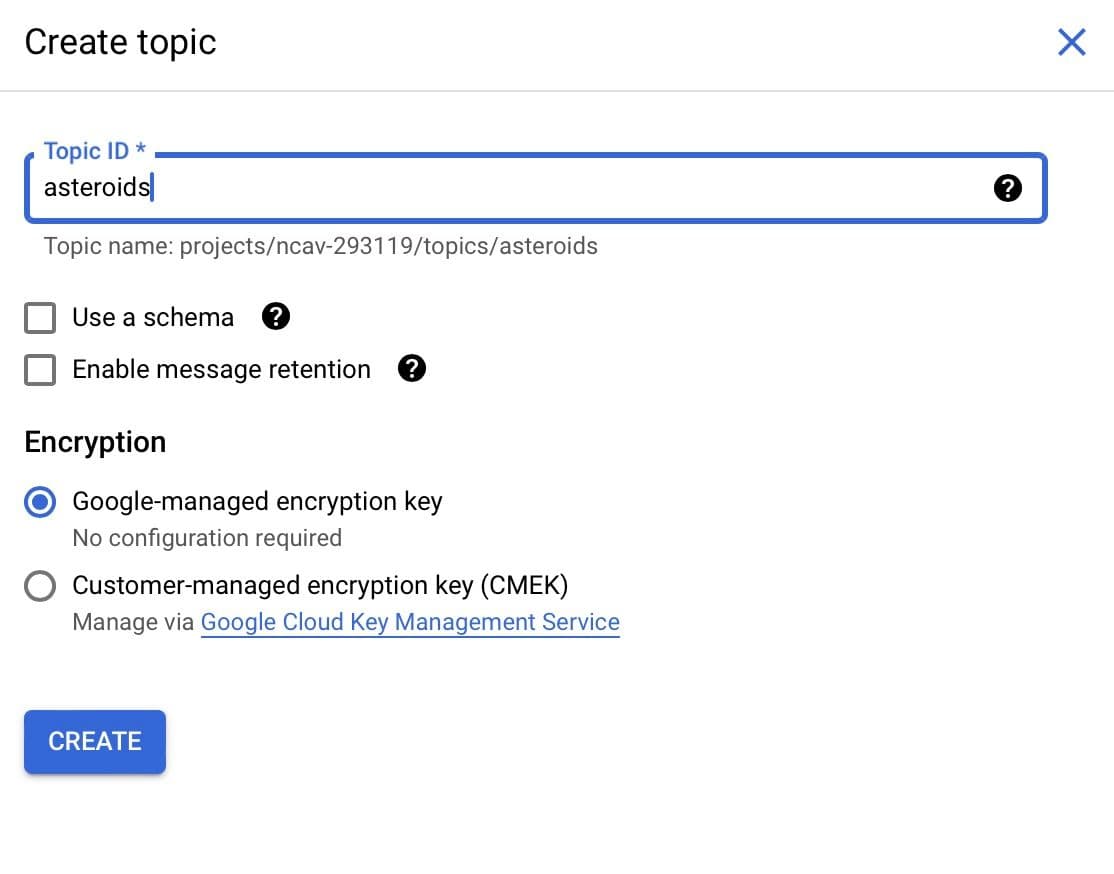 When creating a new topic, you can name your topic ID and select the encryption using a Google-managed encryption key.