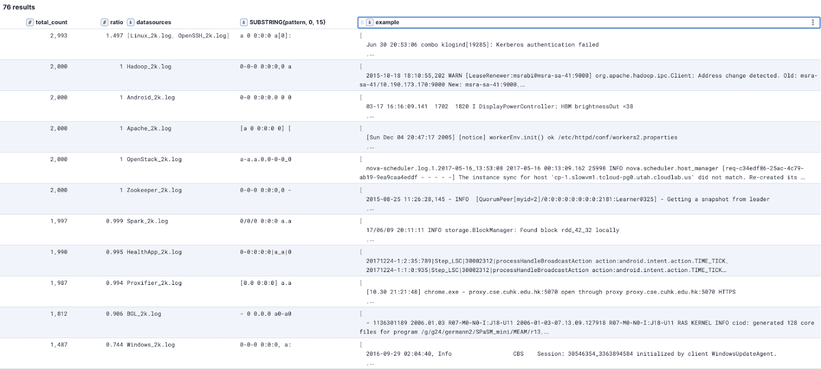 This is a clustering step. We group logs that share the first 15 characters of their pattern and create aggregated fields such as total log count per group, list of log datasources, pattern prefix, 3 log examples