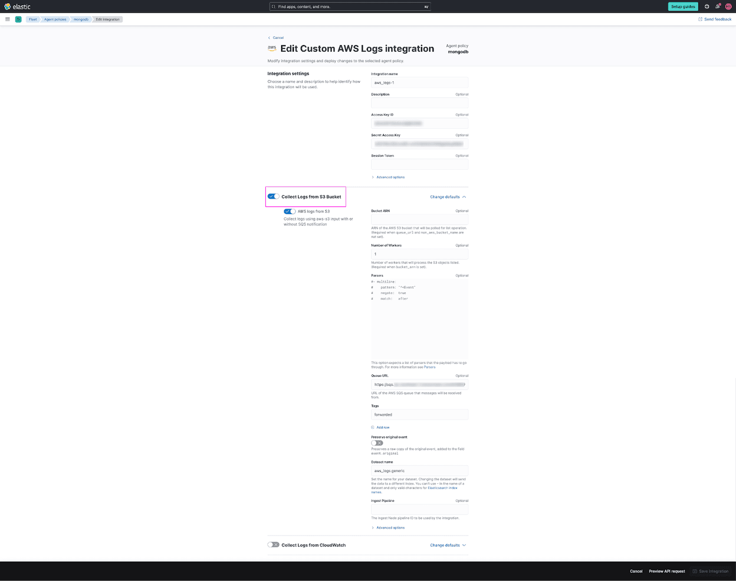 Toggle on “Collect Logs from S3 Bucket” in Custom AWS Logs integration and provide either AWS S3 bucket ARN configured to get MongoDB logs or SQS queue URL. SQS method is recommended as polling all S3 objects is expensive, instead integration can retrieve logs from S3 objects that are pointed to by S3 notification events read from an SQS queue.