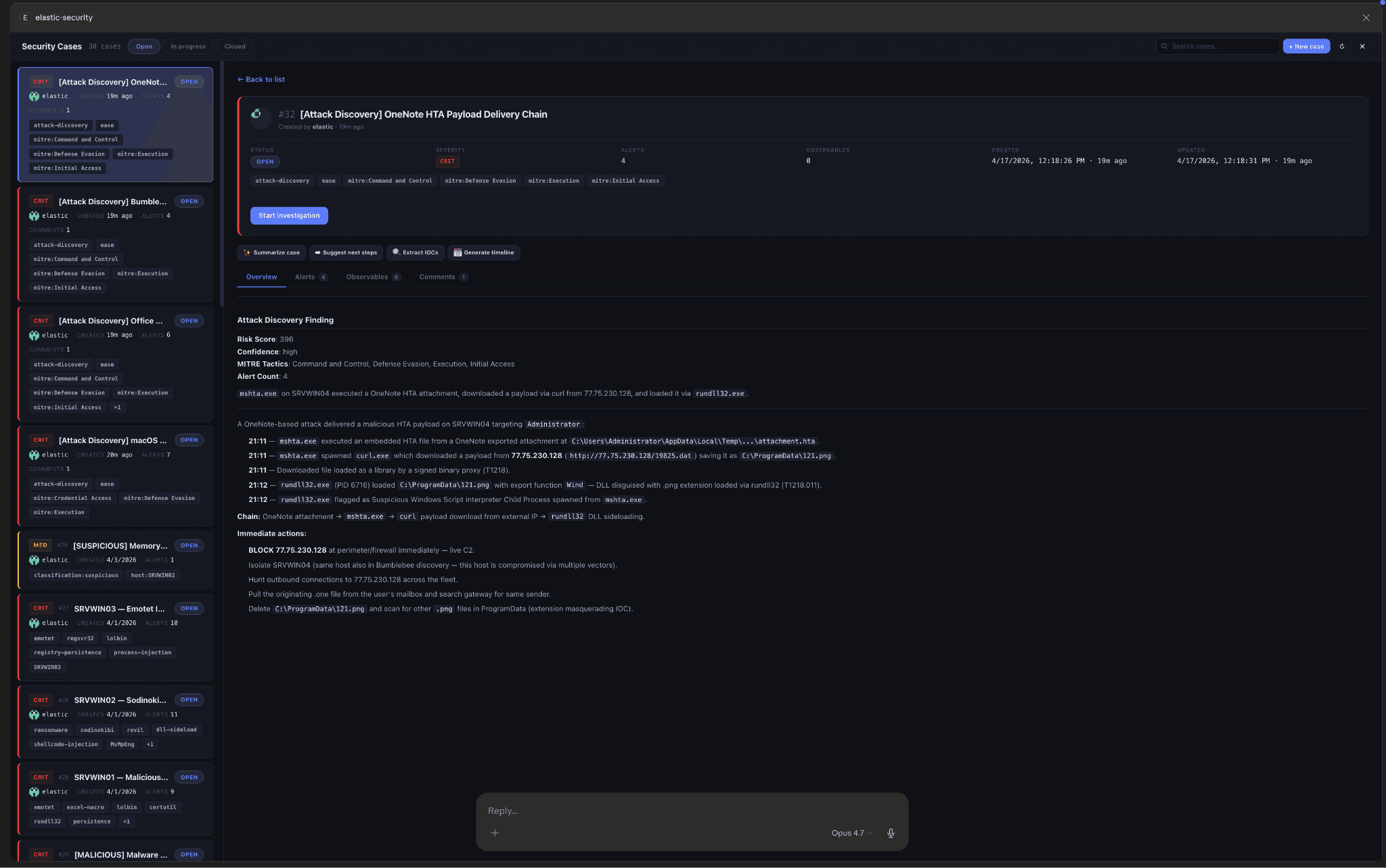 채팅을 떠나지 않고 사례 열기. 결과를 대량으로 승인하거나 에이전트에게 특정 경고에 대한 사례를 열도록 요청하세요. 사례 관리 스킬은 승인된 발견(소스 경고 첨부, 공격 체인에서 상속된 MITRE 전술)당 하나의 사례를 생성하고 실시간 사례 목록을 인라인으로 렌더링합니다. 사례 요약, 다음 단계 제안, IOC 추출, 타임라인 생성 등 AI 작업 버튼이 줄로 포함된 세부 정보 보기를 보려면 사례를 클릭하세요. 각각 구조화된 프롬프트를 채팅에 다시 표시하기 때문에 상담원이 다시 소개할 필요 없이 사례 컨텍스트를 파악할 수 있습니다. 에이전트의 요약은 사례 목록 아래에 있으며 방금 접수된 사례와 아직 필요한 이전 조사 결과를 포함하여 전체 IR 대기열을 다룹니다.