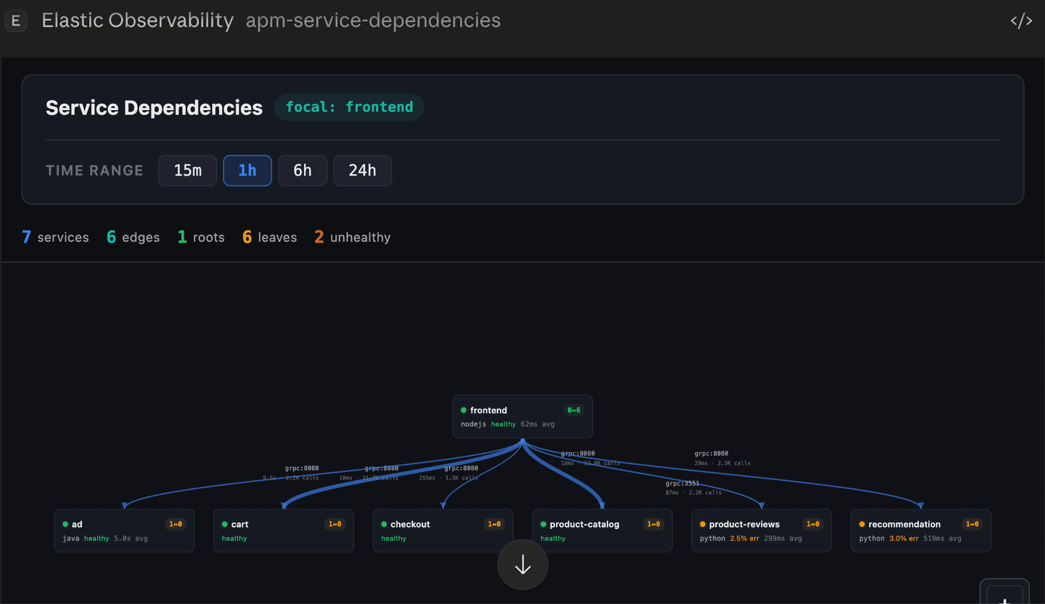 | apm-service-dependencies | Elastic APM | 서비스 종속성 그래프 - 업스트림/다운스트림, 프로토콜, 호출량. |