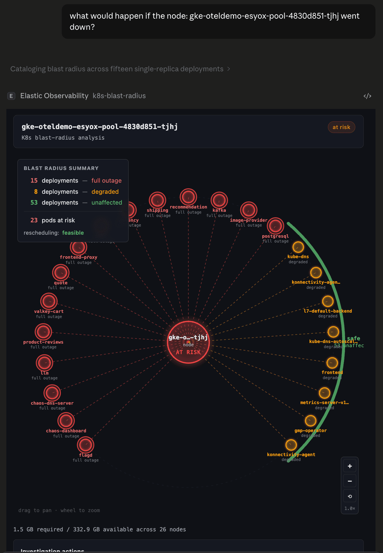 "내 K8s 노드가 다운되면 어떻게 될까?"라고 물어보면 방사형 영향도 다이어그램이 표시됩니다. 중앙에는 대상 노드가 위치하고, 완전 중단되는 배포는 빨간색, 성능 저하되는 배포는 주황색, 영향을 받지 않는 배포는 회색으로 표시됩니다. 플로팅 요약 카드는 위험에 처한 파드와 일정 변경 가능성을 보여줍니다. 단일 복제본 배포는 단일 장애 지점으로 플래그가 지정됩니다.