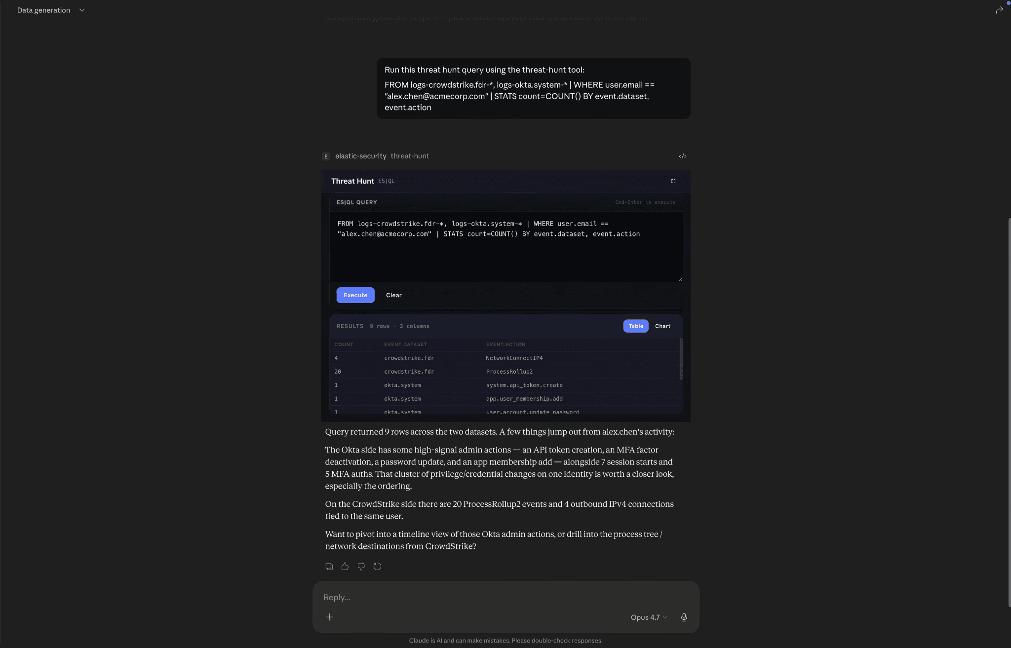 위협 헌팅. 에이전트에게 인덱스 전반에서 헌팅하도록 요청하세요. 위협 헌팅 스킬은 쿼리가 미리 입력되고 자동 실행되는 ES|QL 워크벤치를 반환하며, 결과의 모든 엔티티를 클릭하여 드릴다운할 수 있습니다. 모델은 표 아래에 비정상적인 사항, 연결된 사항, 자세히 살펴볼 가치가 있는 사항 등 짧은 판독값을 기록합니다. 그런 다음 위협 헌팅에 더 깊이 들어가거나 지금까지 수행한 작업을 보완하는 새로운 기술을 MCP 앱 내에서 시작하는 다음 피벗을 제공합니다. 이를 잘 보완하는 것은 Attack Discovery를 시작하여 심층 분석한 경보와 지금까지 수색한 위협에 대한 더 많은 컨텍스트를 수집하는 것입니다. 이와 연계하여 Attack Discovery를 실행하여 지금까지 추적한 경보와 위협에 대한 더 많은 컨텍스트를 수집하는 것도 좋은 방법입니다.