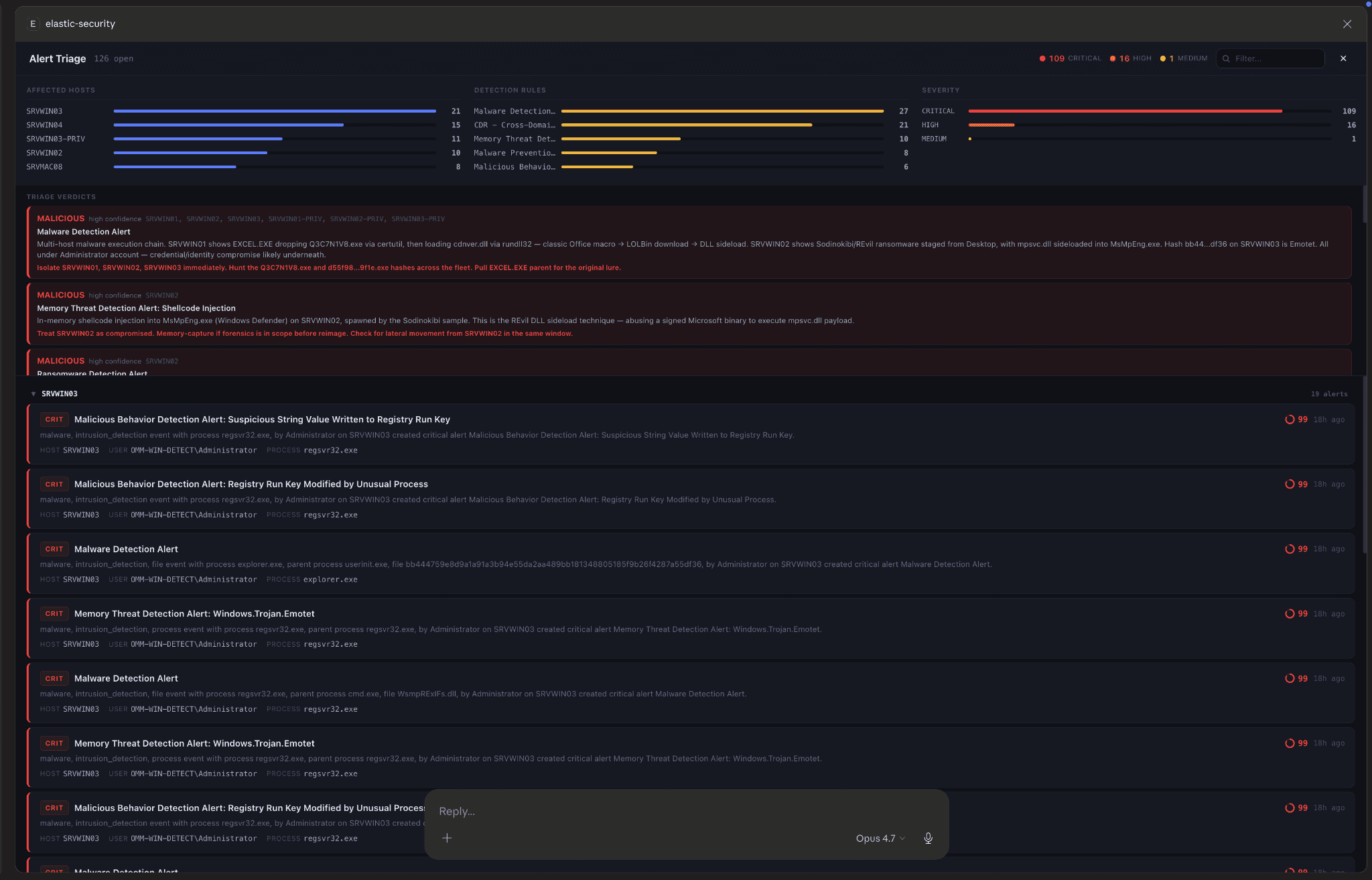 분류 알림. 에이전트에게 호스트, 규칙, 사용자 또는 시간대별로 분류하도록 요청하세요. 알림 분류 스킬은 원시 알림 목록 위에 AI 판정의 대시보드를 반환하며, 탐지 규칙당 하나의 판정이 해당 규칙의 활동을 양성, 의심 또는 악성으로 분류하고 각각 신뢰도 점수와 권장 조치를 함께 표시합니다. 경고를 클릭하면 프로세스 트리, 네트워크 이벤트, 관련 경고 및 MITRE ATT&CK 태그가 포함된 상세 보기를 확인할 수 있습니다. Kibana 내에서 AI 대화와 경고 대시보드 사이를 전환할 필요 없이 모든 작업이 대화 내에서 실시간으로 이루어집니다.