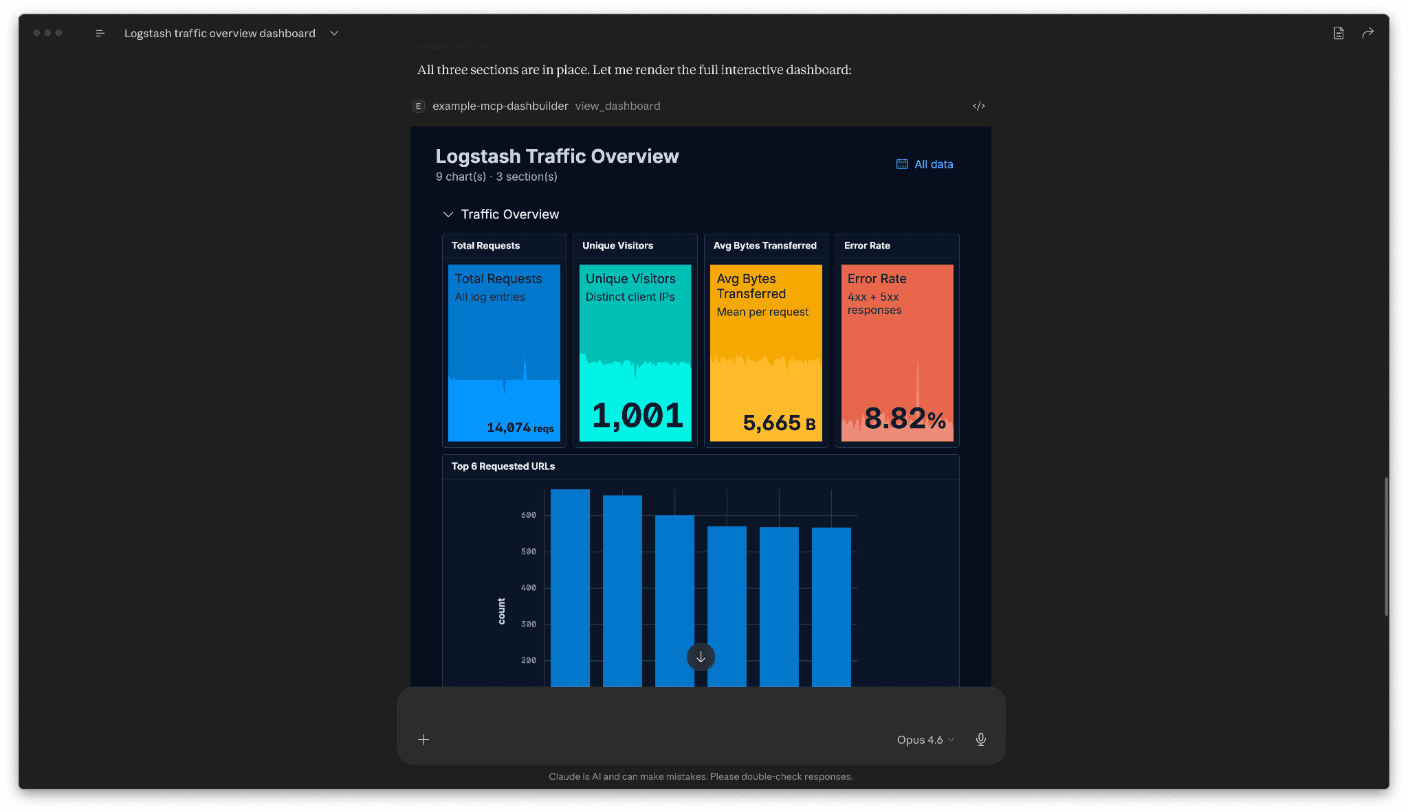 내부적으로는 동일한 MCP 앱 패턴을 따릅니다. Node.js 서버는 view_dashboard 모델 관련 도구와 UI가 직접 호출하는 앱 전용 도구 세트(데이터 가져오기, 레이아웃 지속, 시간 필드 탐지, 내보내기/가져오기)를 등록합니다. 대시보드 보기 자체는 vite-plugin-singlefile 에 번들로 제공되는 하나의 독립된 HTML 파일로, MCP 앱 리소스로 제공됩니다. 리포지토리를 포크하는 빌더는 Security 앱에 표시되는 것과 동일한 서버 셸과 호스트 브리지가 다른 작업을 가리키게 됩니다. example-mcp-dashbuilder README에는 전체 아키텍처 및 차트 유형 참조가 있습니다.