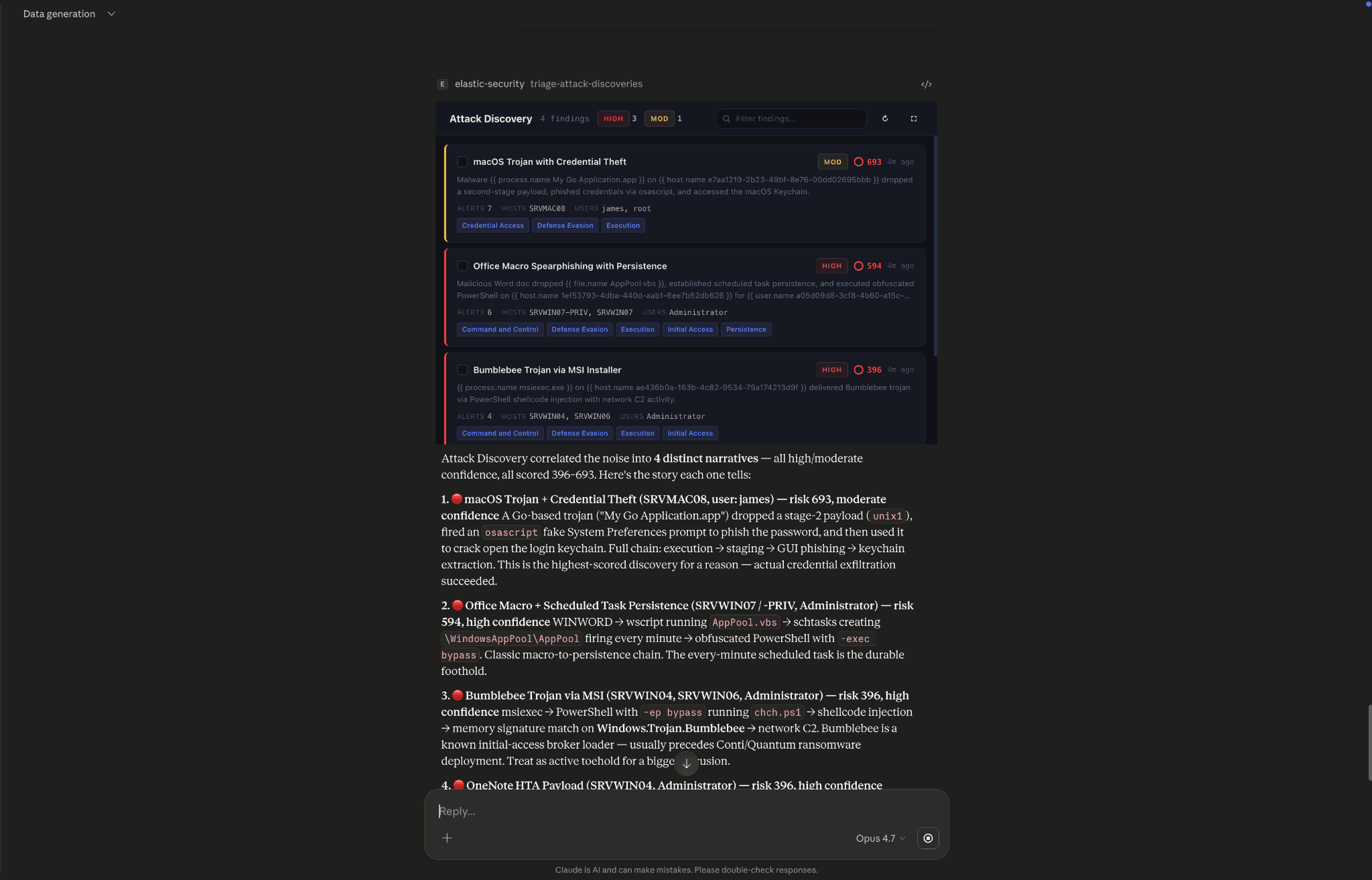 Attack Discovery 실행. Attack Discovery 스킬은 Attack Discovery API를 호출하여 발견된 정보의 순위 목록을 반환합니다. 각 발견 항목은 관련 경보를 하나의 공격 체인으로 통합한 것으로, MITRE 전술, 위험 점수, 신뢰도 레이블, 그리고 영향을 받은 호스트 및 사용자가 먼저 표시됩니다. 에이전트의 요약은 동일한 순위 순서로 결과 아래에 표시되며, 이제 대화에는 다음 단계를 위해 준비된 헌트 쿼리, 분류 결정, 상관 관계 체인 등 행동에 필요한 모든 것이 담겨 있습니다.