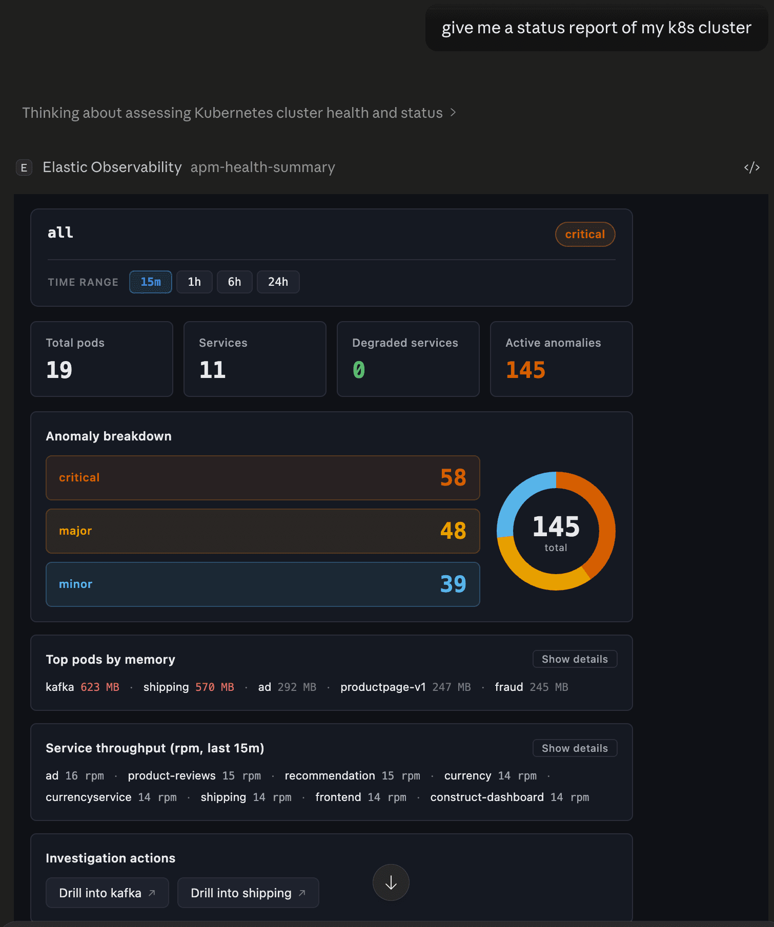 "뭐가 고장났어?" 또는 "상태 보고서를 줘"라고 요청하면 한 번에 모든 정보를 확인할 수 있습니다. 전반적인 상태 배지, 문제가 있는 서비스와 그 이유, 최상위 포드 메모리 소비자, 이상 심각도 분석, 서비스 처리량 등 모두 하나의 인라인 뷰에서 확인할 수 있습니다. 뭔가 이상하다고 느껴지지만 어디부터 살펴봐야 할지 모를 때 시작점이 바로 여기입니다. 보기는 배포에서 지원하는 항목에 따라 조정됩니다. APM은 서비스 상태를 제공합니다. Kubernetes 메트릭에 Pod 및 Node 컨텍스트가 추가됩니다. ML 작업은 이상 징후를 탐지합니다.