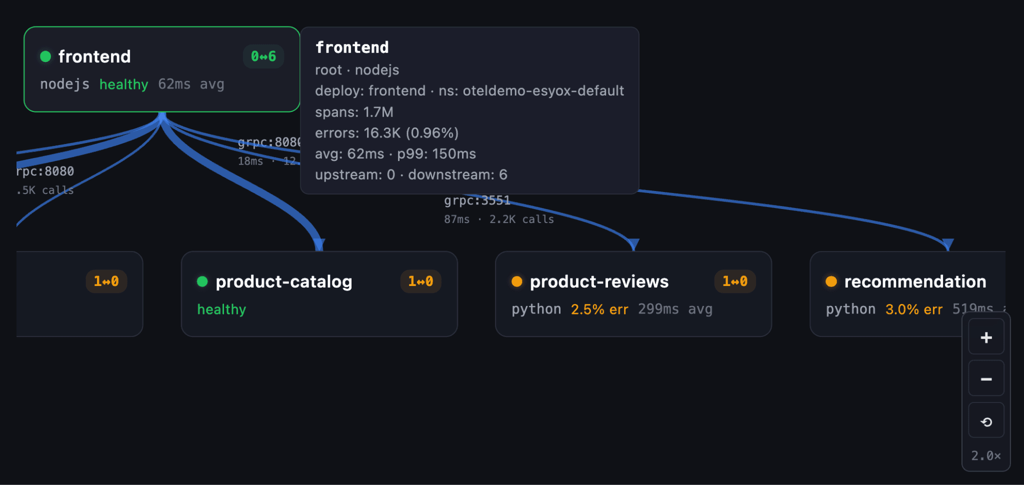 확대/축소, 이동, 마우스오버를 통해 복잡한 서비스 관계를 이해하는 데 필요한 모든 세부 정보를 확인할 수 있습니다.